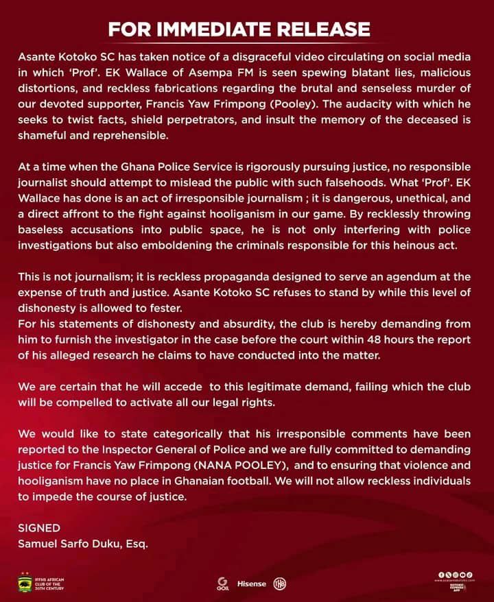 Asante Kotoko SC has taken notice of a disgraceful video circulating on social media in which 'Prof.' EK Wallace of Asempa FM is seen spewing blatant lies, malicious distortions, and reckless fabrications regarding the brutal and senseless murder of our devoted supporter, Francis Yaw Frimpong (Pooley).