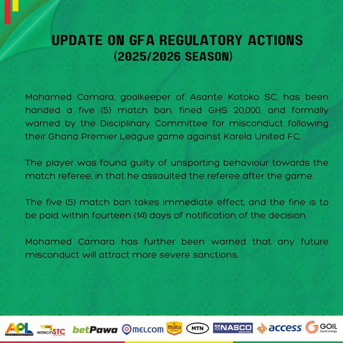 Camara has also been warned that any further misconduct could attract harsher punishment. The disciplinary action comes amid a tense Ghana Premier League encounter in March, where Kotoko suffered a narrow 1-0 defeat to Karela United.