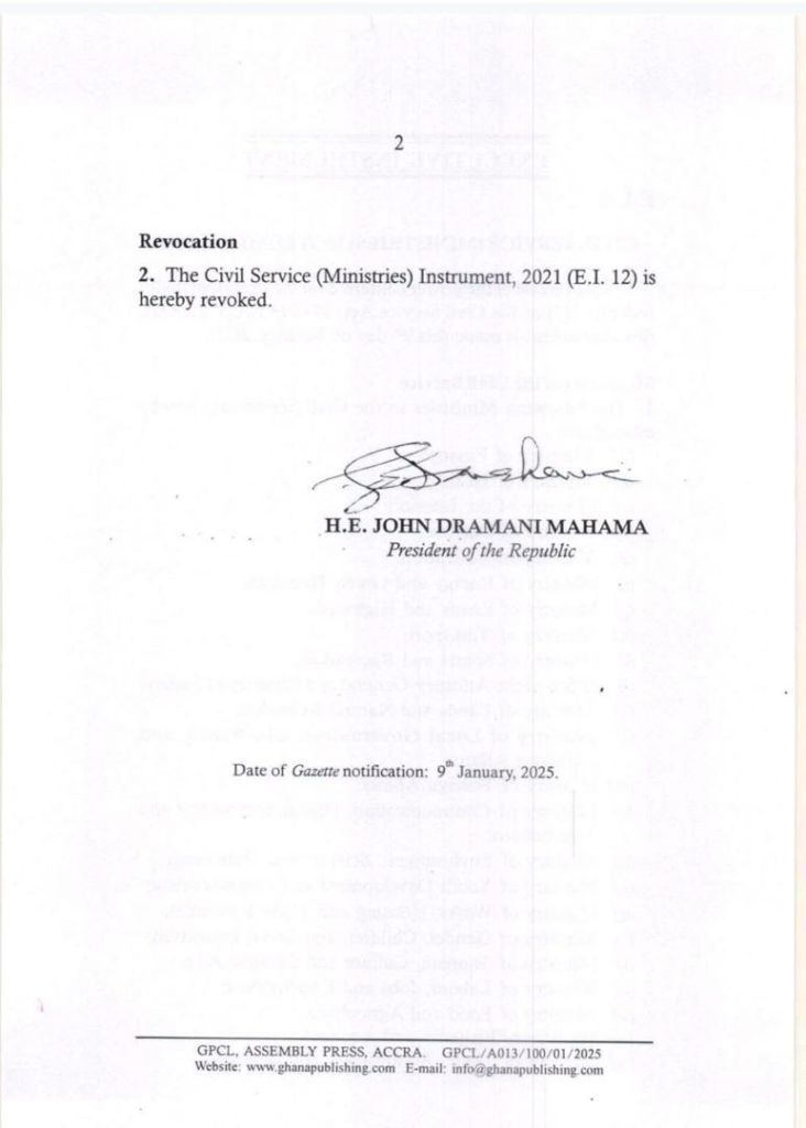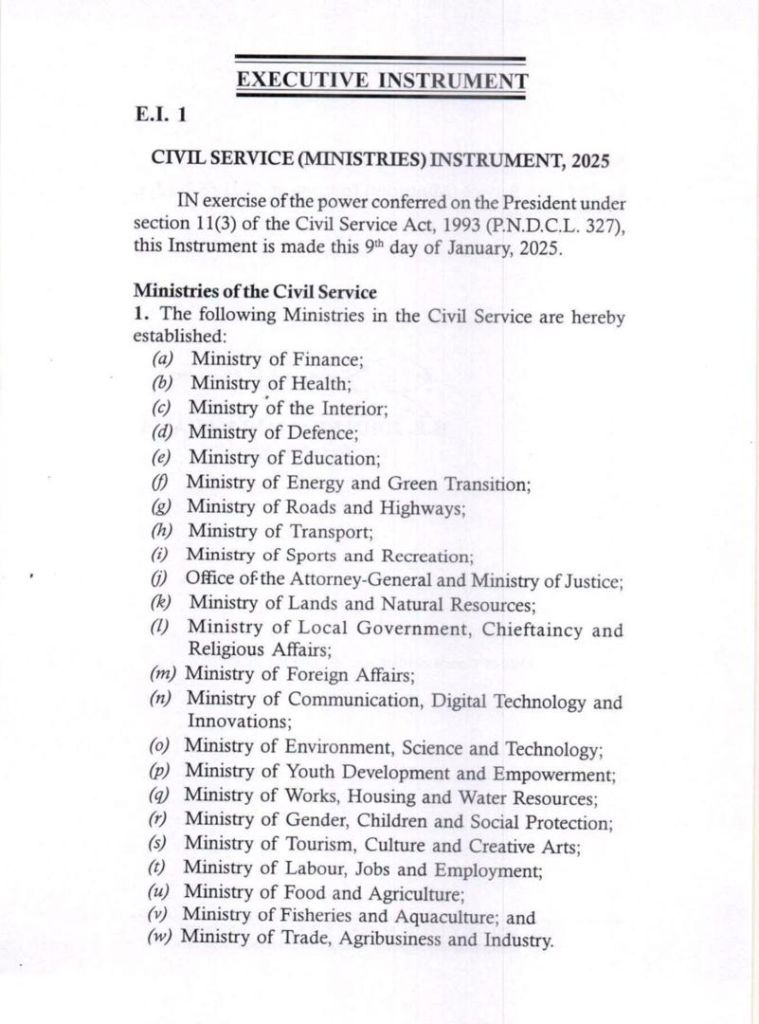 By an executive instrument dated 9th January 2025, the ministries of Ghana, being the bulwark of the architecture of the civil service, were reviewed and realigned by President John Mahama, pursuant to the Civil Service Act, 1993, PNDCL 327.