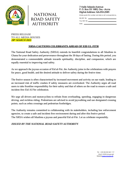 The National Road Safety Authority (NRSA) has cautioned the public to heed to road safety practices during the celebrations of Eid-Ul-Fitr.