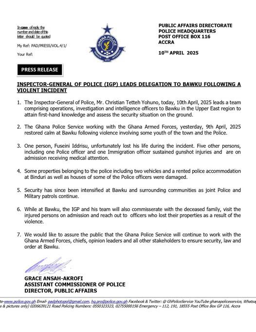 Meanwhile, the Inspector-General of Police, Mr Christian Tetteh Yohuno, today, 10 April 2025, led a team comprising operations, investigations, and intelligence officers to Bawku to obtain first-hand information and assess the security situation on the ground.