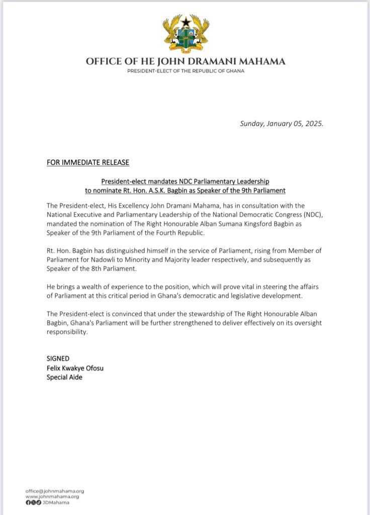 President-elect John Dramani Mahama has directed the National Democratic Congress (NDC) parliamentary leadership to propose the Right Honourable Alban Sumana Kingsford Bagbin as Speaker for the 9th Parliament of Ghana’s Fourth Republic.