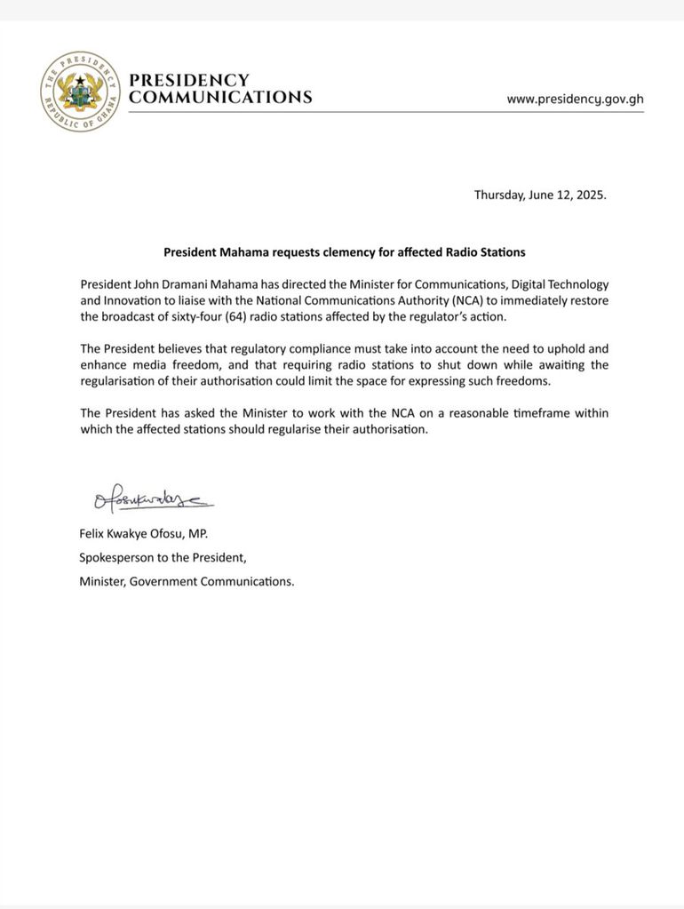Furthermore, President Mahama has instructed the communications minister to work with the NCA to establish "a reasonable timeframe within which the affected stations should regularise their authorisation".
