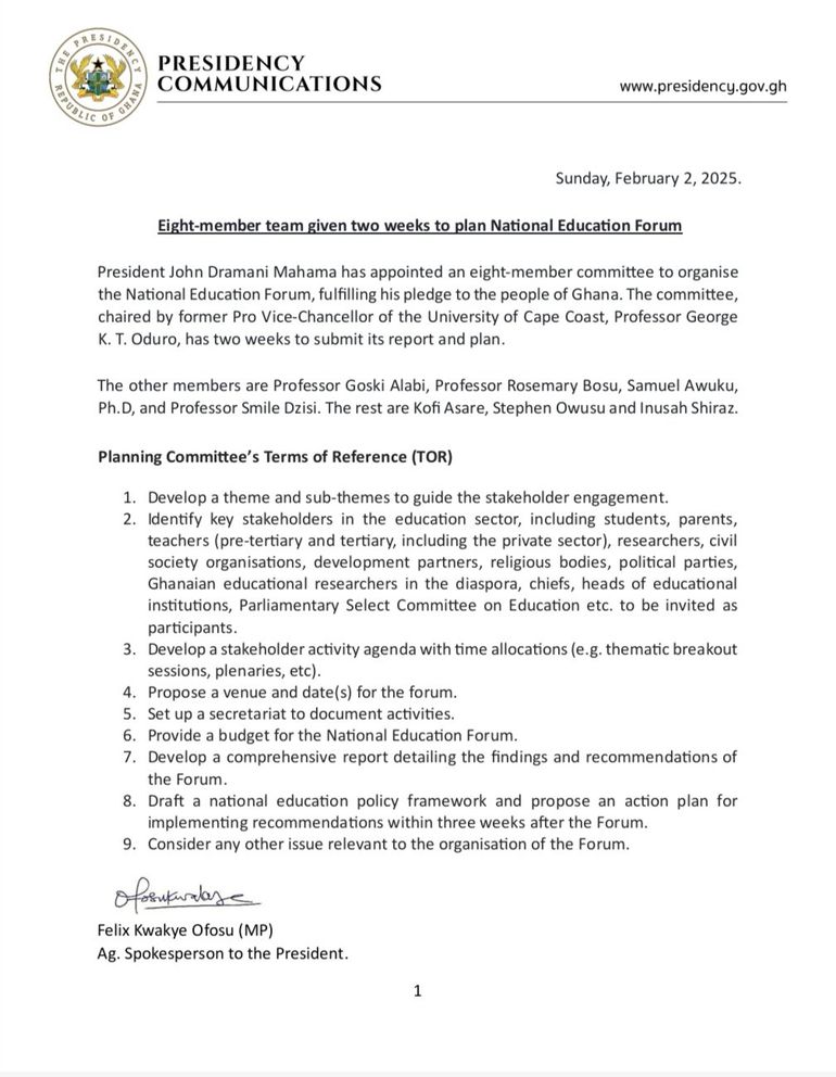 President John Dramani Mahama has appointed an eight-member committee to oversee the planning and execution of the National Education Forum, as part of his commitment to improving Ghana’s education sector.