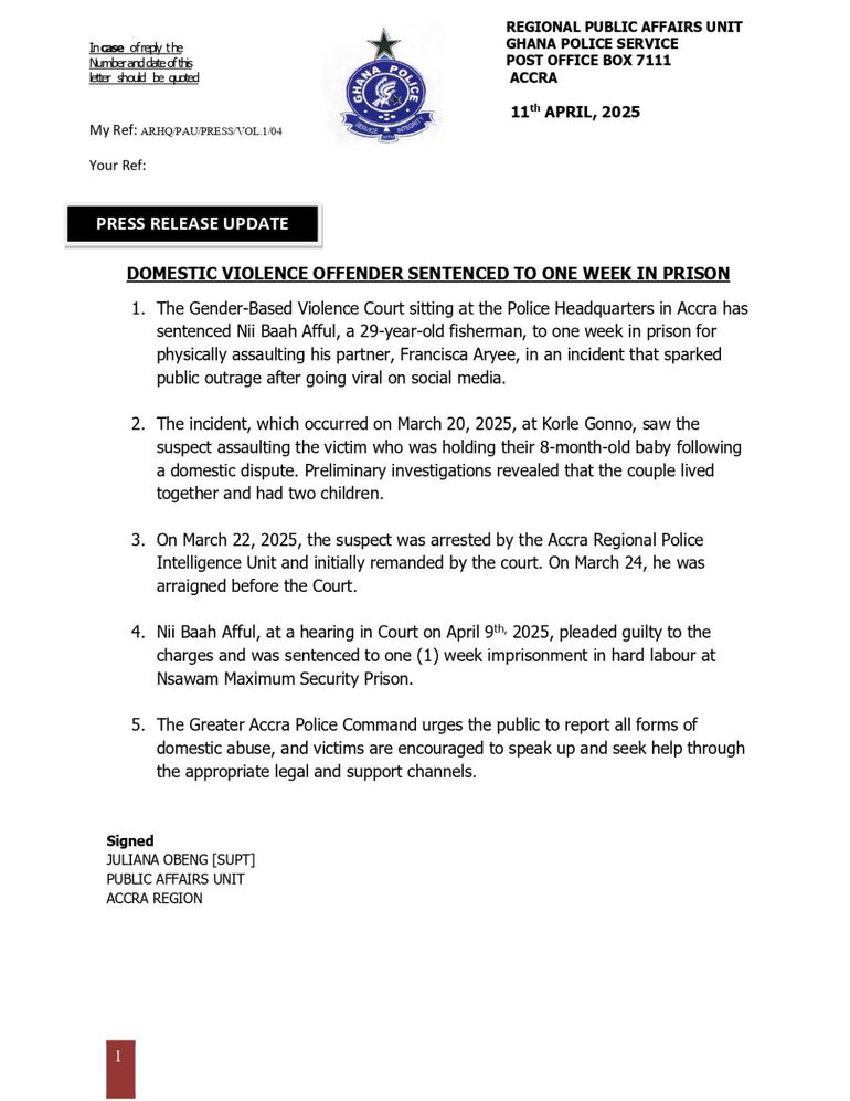The Gender-Based Violence Court, sitting at the Police Headquarters in Accra, has sentenced Nii Baah Afful, a 29-year-old fisherman, to one week in prison for physically assaulting his partner, Francisca Aryee, in an incident that sparked widespread public outrage after going viral on social media.