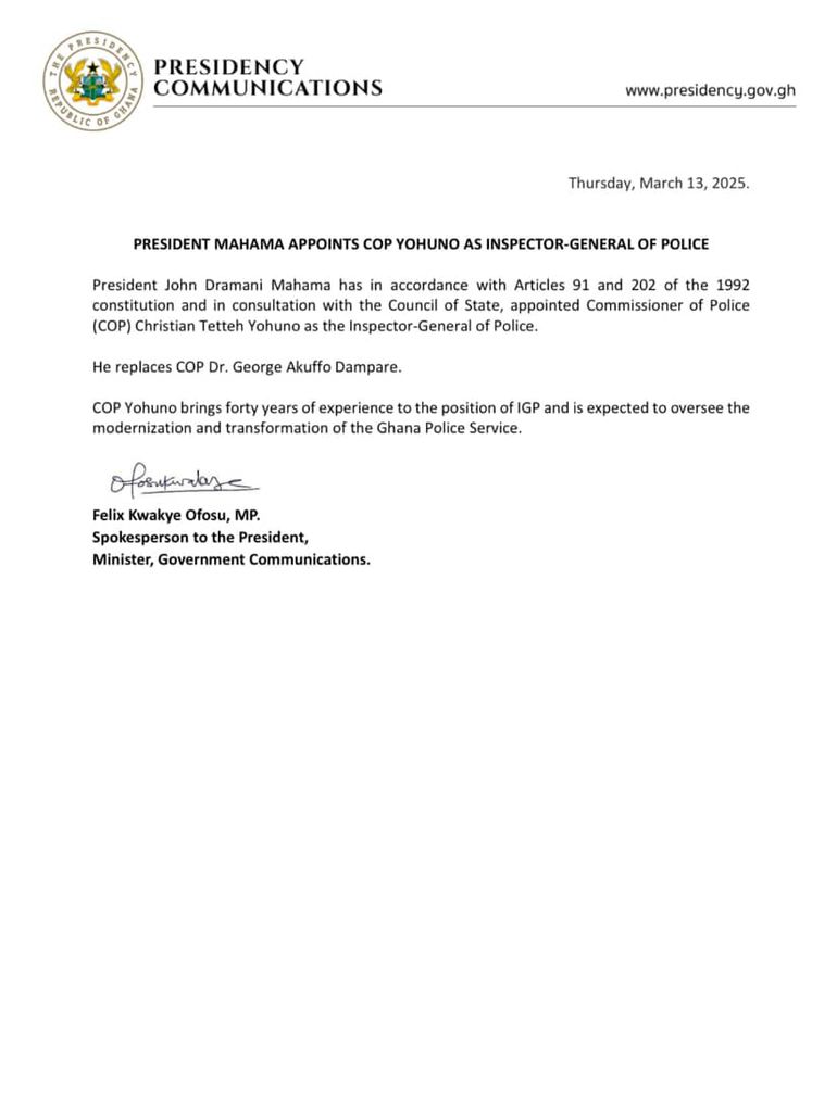 COP Yohonu brings forty years of experience to the position of IGP and is expected to oversee the modernisation and transformation of the Ghana Police Service.
