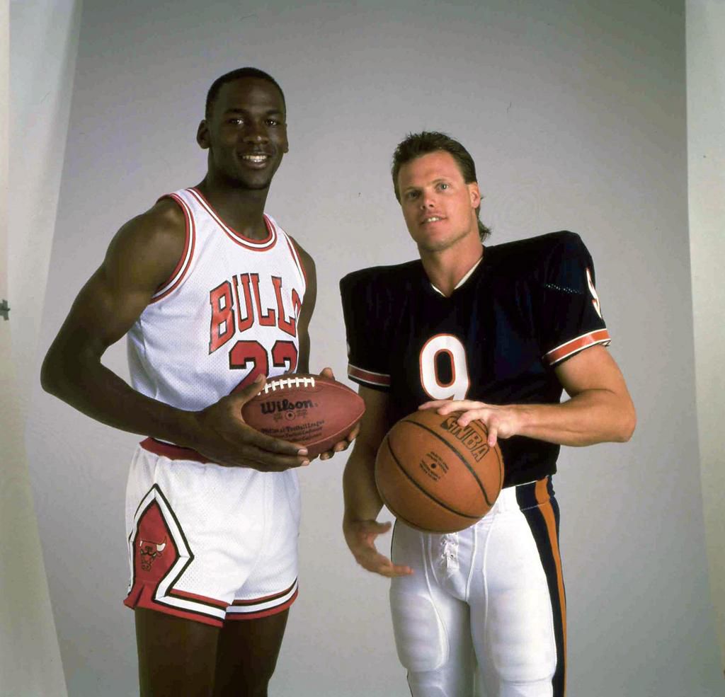 1984: A Chicago Star Jordan entered the NBA with a bang and was marketed as the next big star. Here, he's photographed with Chicago Bears quarterback Jim McMahon. Bill Smith - Getty Images