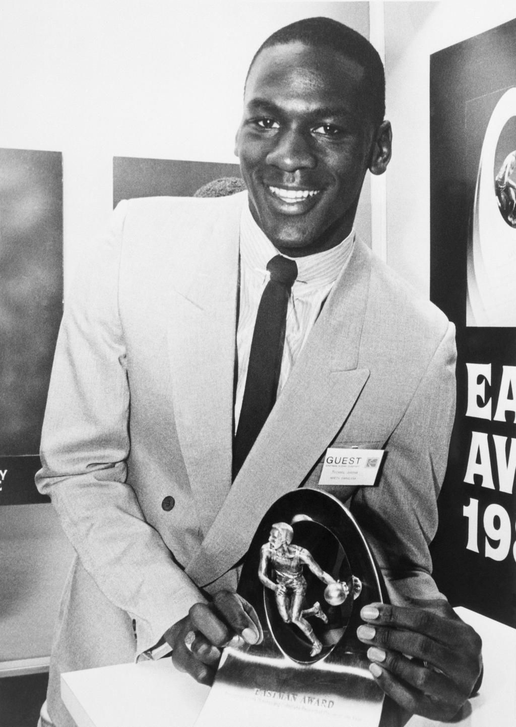 1984: The Eastman Award In 1984, Jordan was given the Eastman Award, which every year is awarded to a top collegiate basketball player. Here, the young player is seen holding his award. Bettmann - Getty Images