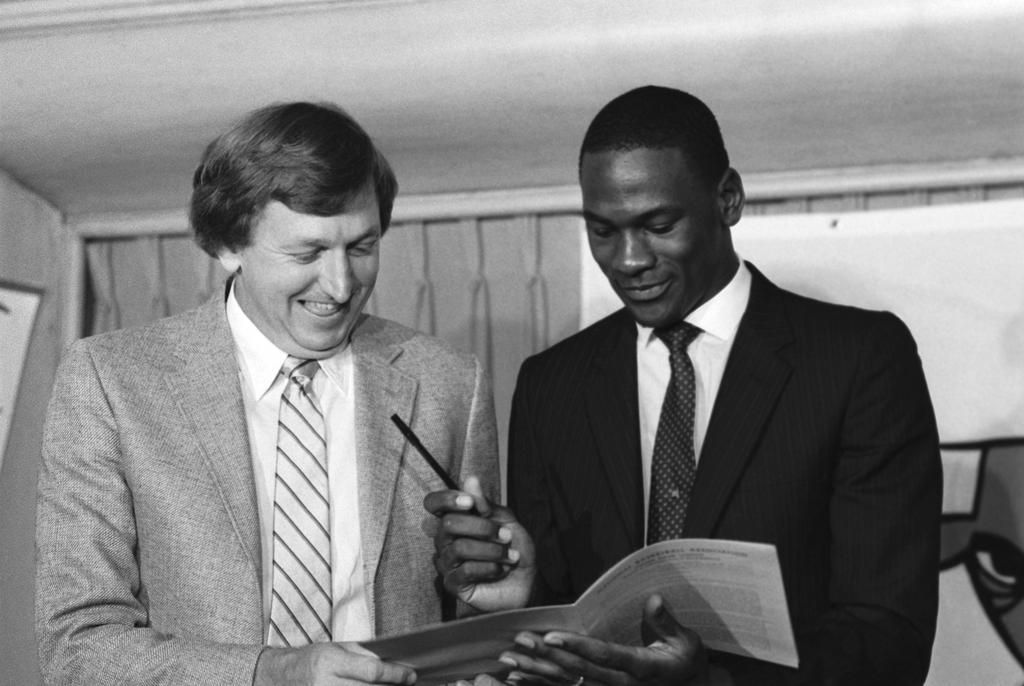 1984: Entering the Draft In a press conference with Coach Smith, Jordan announced that he was forgoing his final season at Carolina to enter the NBA draft. Bettmann - Getty Images