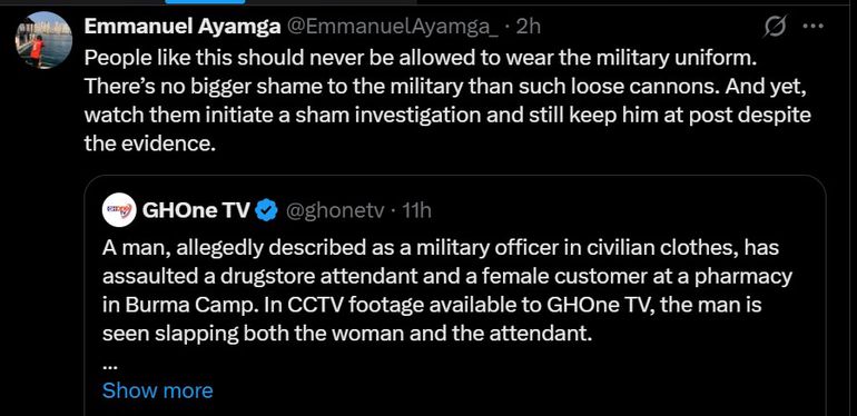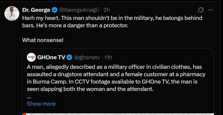 A man, allegedly described as a military officer in civilian clothes, has assaulted a drugstore attendant and a female customer at a pharmacy in Burma Camp. In CCTV footage available to GHOne TV, the man is seen slapping both the woman and the attendant.