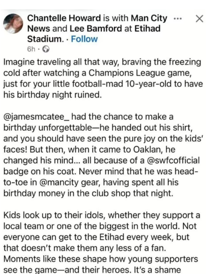 Imagine traveling all that way, braving the freezing cold after watching a Champions League game, just for your little football-mad 10-year-old to have his birthday night ruined. James McAtee had the chance to make a birthday unforgettable—he handed out his shirt, and you should have seen the pure joy on the kids' faces! But then, when it came to Oaklan, he changed his mind… all because of a Sheffield Wednesday badge on his coat.