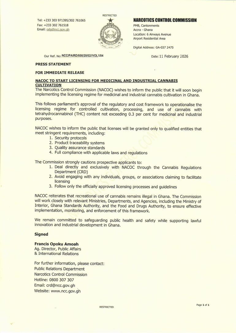 In a press statement dated 11 February 2026 and signed by Francis Opoku Amoah, Acting Director of Public Affairs and International Relations, NACOC said the framework provides for the controlled cultivation, processing and use of cannabis with tetrahydrocannabinol (THC) content not exceeding 0.3% strictly for medicinal and industrial purposes.