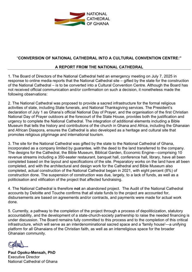 In a strongly worded statement issued on Tuesday, 8 July 2025, the Executive Director of the National Cathedral Secretariat, Dr Paul Opoku-Mensah, said the Board has not received any official communication from the government regarding the reported plans.