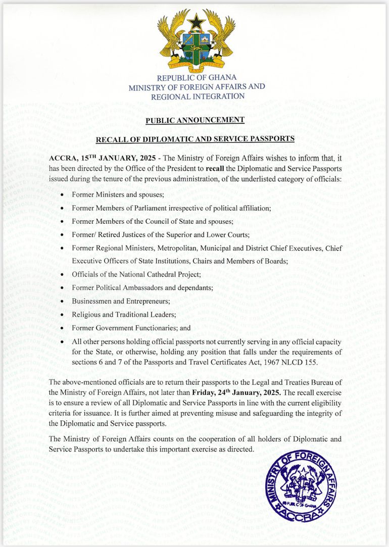 In a letter dated Tuesday, 14th January, addressed to the Chief Director of the Ministry, the Secretary to the President, Dr Callistus Mahama, stated that the recall aims to safeguard the country’s integrity and reinforce the government’s commitment to ensuring the proper use of official travel documents.