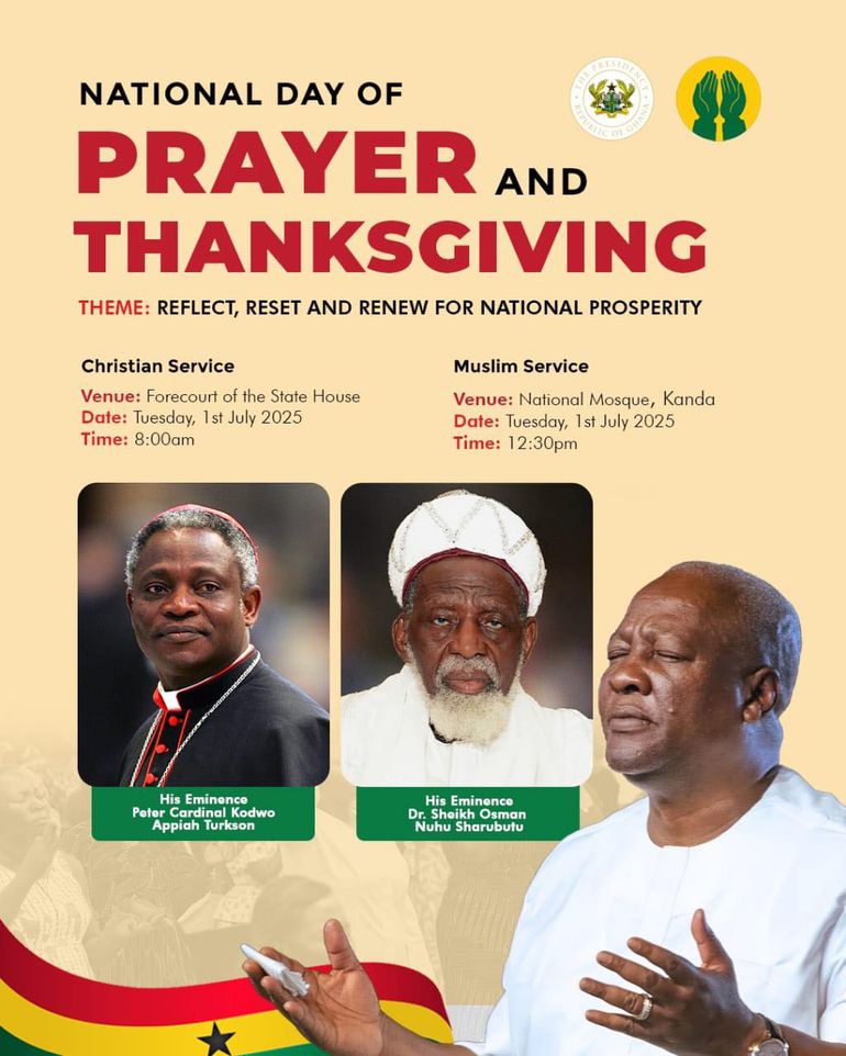 The Islamic Prayer and Thanksgiving Service is scheduled for 12:30 p.m., to be led by the National Chief Imam, Sheikh Osmanu Nuhu Sharubutu, at the Ghana National Mosque in Kanda.