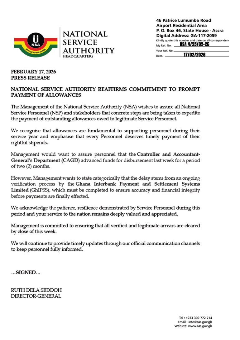 In a press release dated 17 February 2026 signed by the Director-General Ruth Dela Seddoh, the Authority reaffirmed its commitment to the prompt payment of stipends, acknowledging concerns raised by personnel over delays.