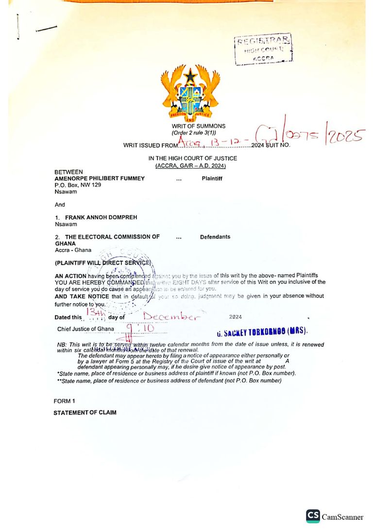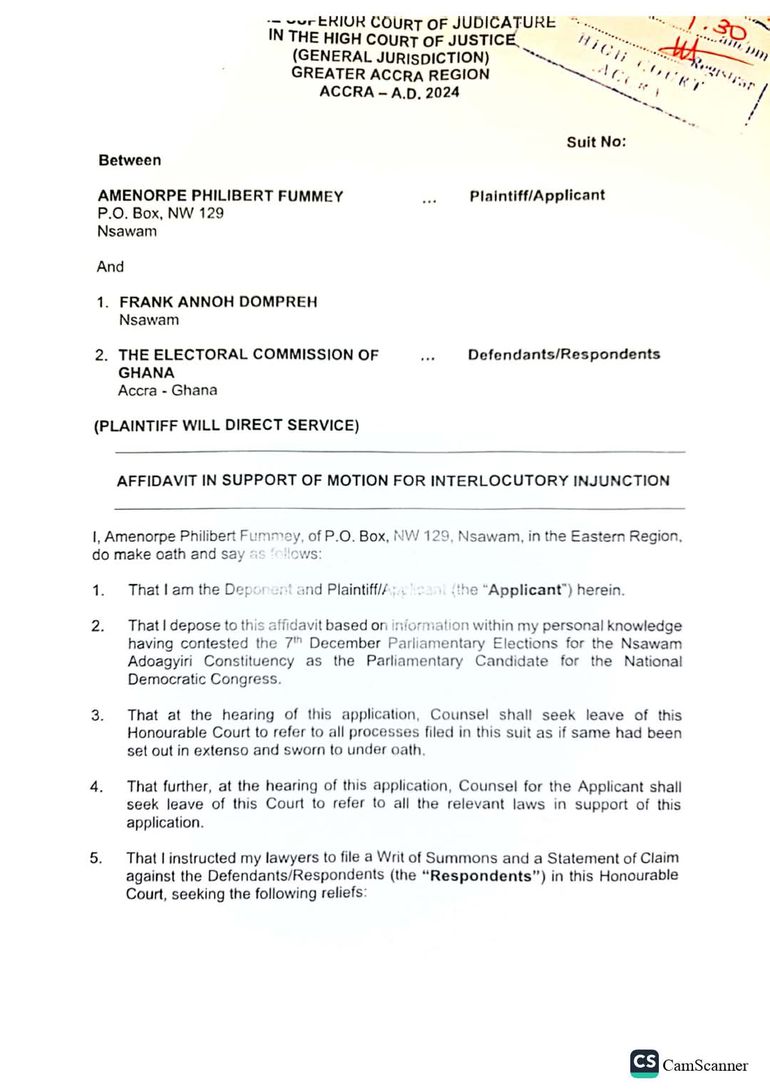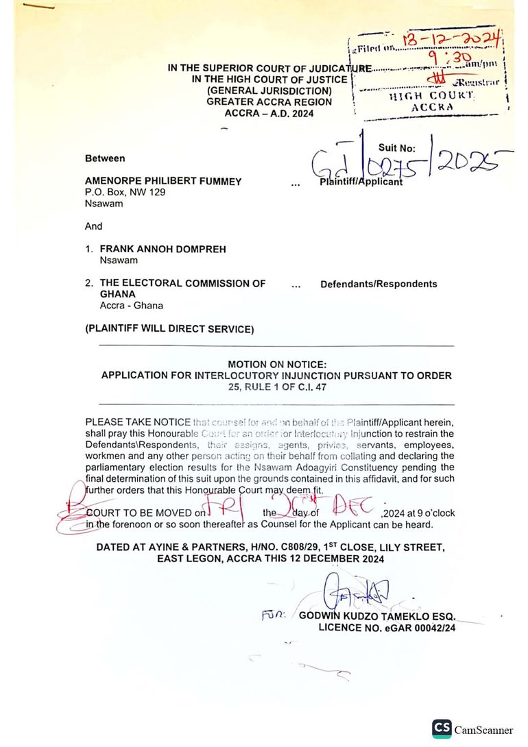 The NDC has argued that the re-collation is unlawful and, as a result, filed for an injunction to halt the process. In a writ submitted by the party’s Head of Legal Affairs, Edudzi Tamakloe on behalf of the party's candidate, at an Accra High Court on Friday, 13 December 2024, the NDC requested the court to suspend the collation and declaration of results for the constituency until the matter is resolved.