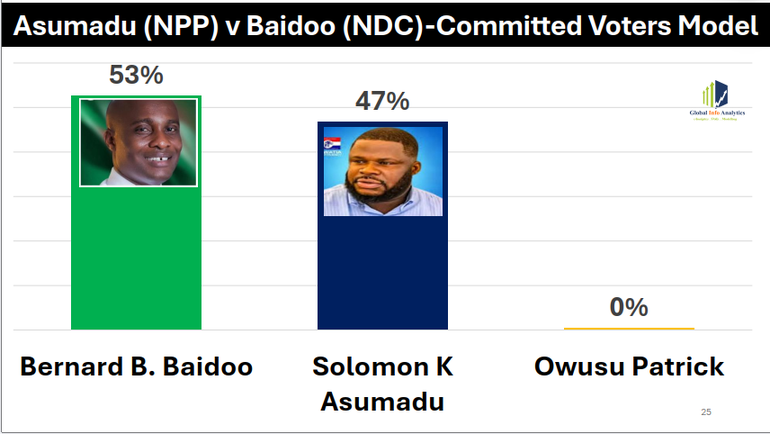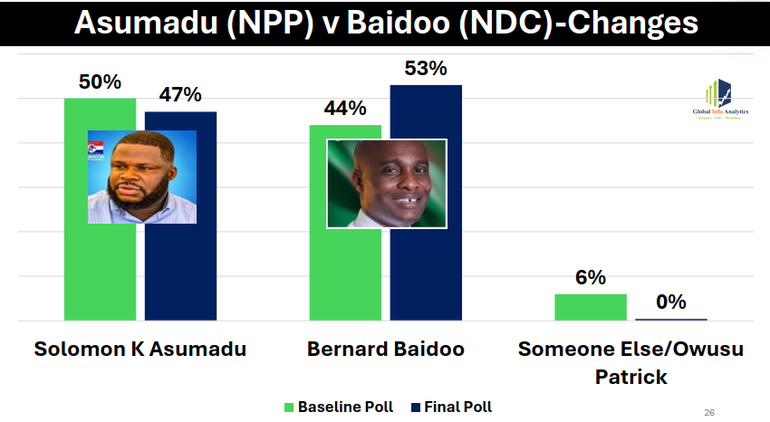 According to the poll, Mr Baidoo is leading with 53% of voter support compared to 47% for Solomon Asumadi of the opposition New Patriotic Party (NPP), while the third candidate, Owusu Patrick, is expected to secure 0%.