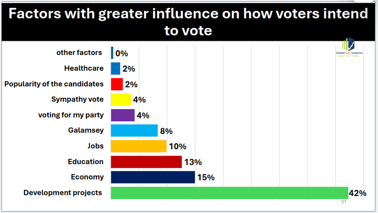 A breakdown of the findings shows that 42% of voters are influenced by development projects, 15% by the economy, 13% by education, 10% by jobs, and 8% by issues related to galamsey, among other factors.