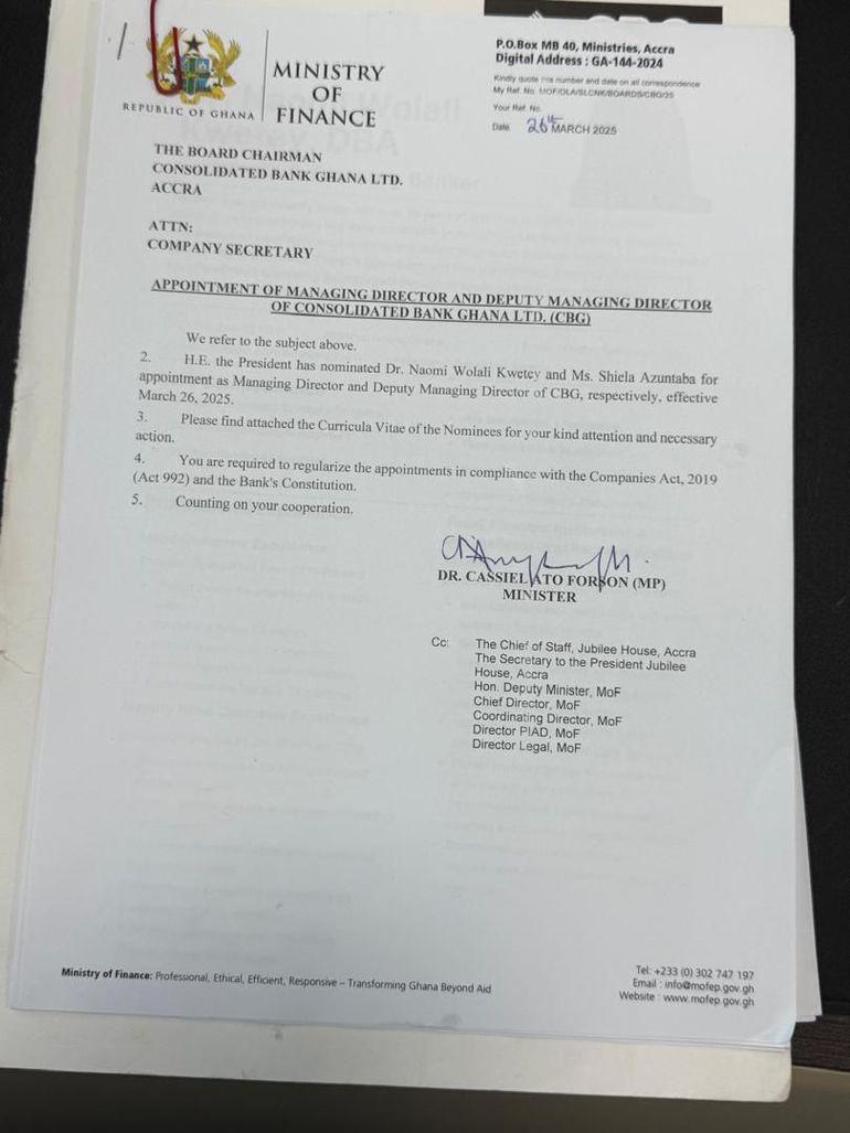 The letter was signed by the Minister for Finance, Dr Cassiel Ato Forson, and addressed to the Board Chairman of CBG.