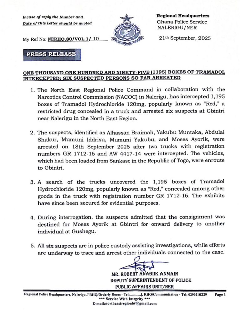 The North East Regional Police Command, in collaboration with the Narcotics Control Commission (NACOC), has made a major seizure of restricted pharmaceutical drugs in Nalerigu. Officers intercepted 1,195 boxes of Tramadol Hydrochloride 120mg, commonly referred to as Red, concealed in a truck, leading to the arrest of six suspects.