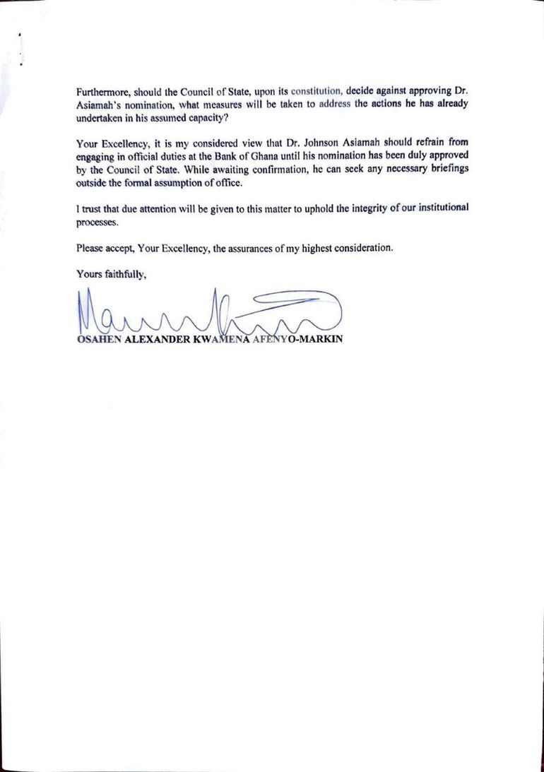 Alexander Afenyo-Markin, therefore, urged the President to direct Dr Johnson Asiamah to refrain from engaging in official duties at the Bank of Ghana until his nomination has been duly approved by the Council of State.