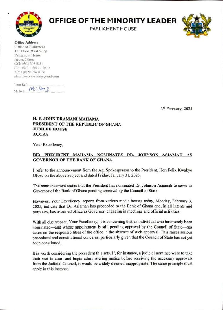 Minority Leader and MP for Effutu, Alexander Afenyo-Markin, has written to President John Mahama, raising concerns over the newly appointed Governor of the Bank of Ghana, Dr Johnson Asiamah, assuming his role before receiving the necessary approval.