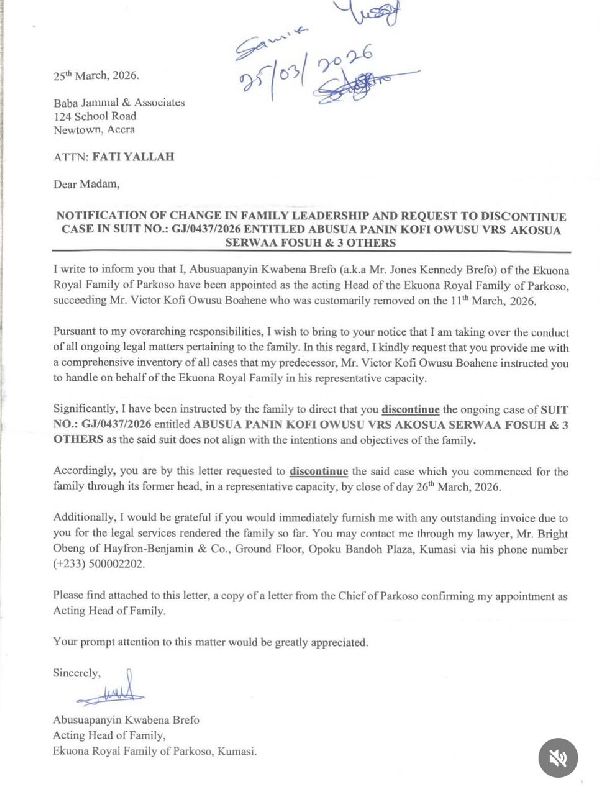 In a letter dated 25 March 2026 and addressed to Baba Jamal & Associates, legal counsel for the former family head, Kofi Owusu, Abusuapanyin Kwabena Brefo announced that he has officially assumed leadership of the family. He explained that his appointment followed the customary removal of Victor Kofi Owusu Boahene on 11 March 2026.