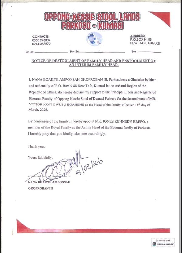 To substantiate his authority, Brefo attached an official letter from the Chief of Parkoso confirming his appointment as the acting family head.