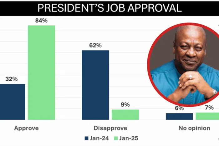A new national poll conducted by Global InfoAnalytics has revealed that 84% of Ghanaians approve of President John Dramani Mahama’s performance, just a month into his tenure.