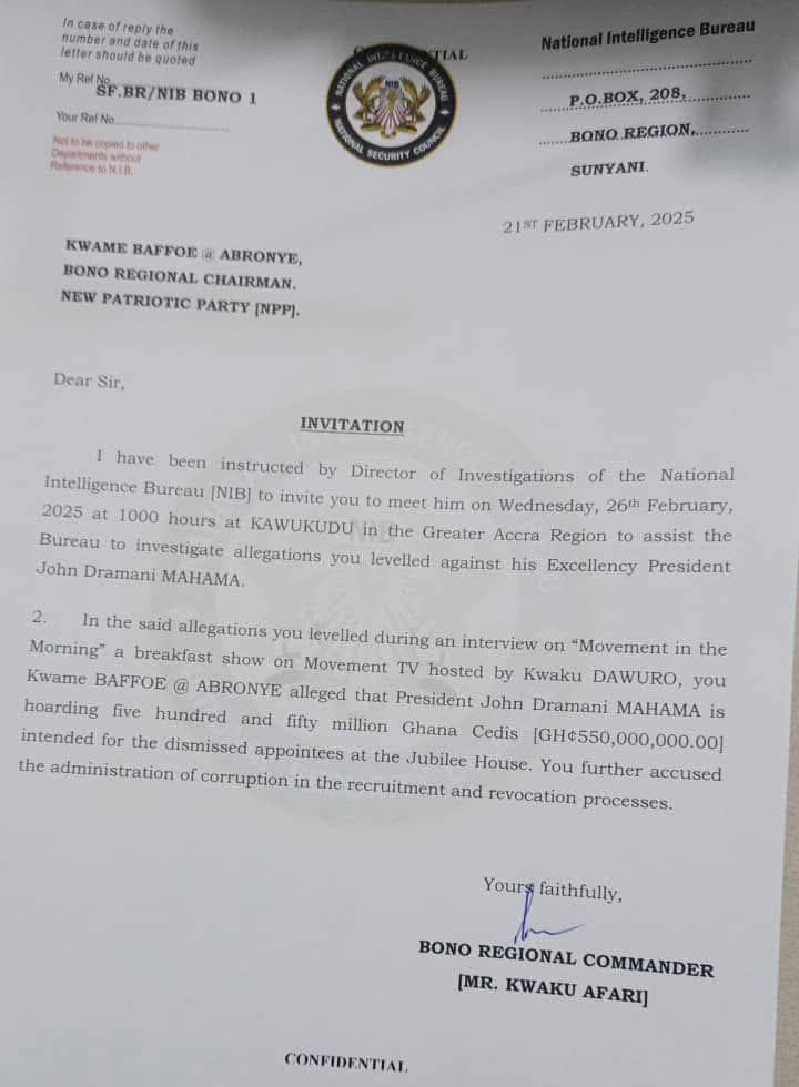 I have been instructed by the Director of Investigations of the National Intelligence Bureau (NIB) to invite you to meet him on Wednesday, 26th February 2025, at 10:00 hours at KAWUKUDU in the Greater Accra Region to assist the Bureau in investigating allegations you have levelled against His Excellency, President John Dramani Mahama.
