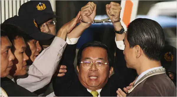 Taiwan’s former President Chen Shui-bian was sentenced to life imprisonment in September 2009 on corruption charges, including bribery and money laundering. His sentence was later reduced to 20 years. He had served as Taiwan’s president from 2000 to 2008 and was the island’s first leader from the Democratic Progressive Party.