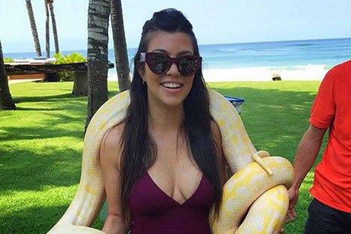 Wearing nothing but a swim suit, Kourtney, posed with this giant python around a neck, and she looks happy. The snake may be sedated, but some people would still be scared to hold it let alone, have it around their neck, but Kourtney obviously does not look scared at all.