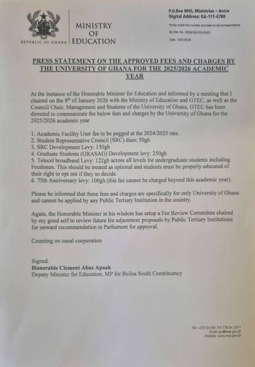 “This release is intended to bring clarity and resolve all outstanding issues relating to the University of Ghana’s 2025/2026 fees,” the statement said, adding that GTEC expects the cooperation of all stakeholders to ensure smooth implementation.