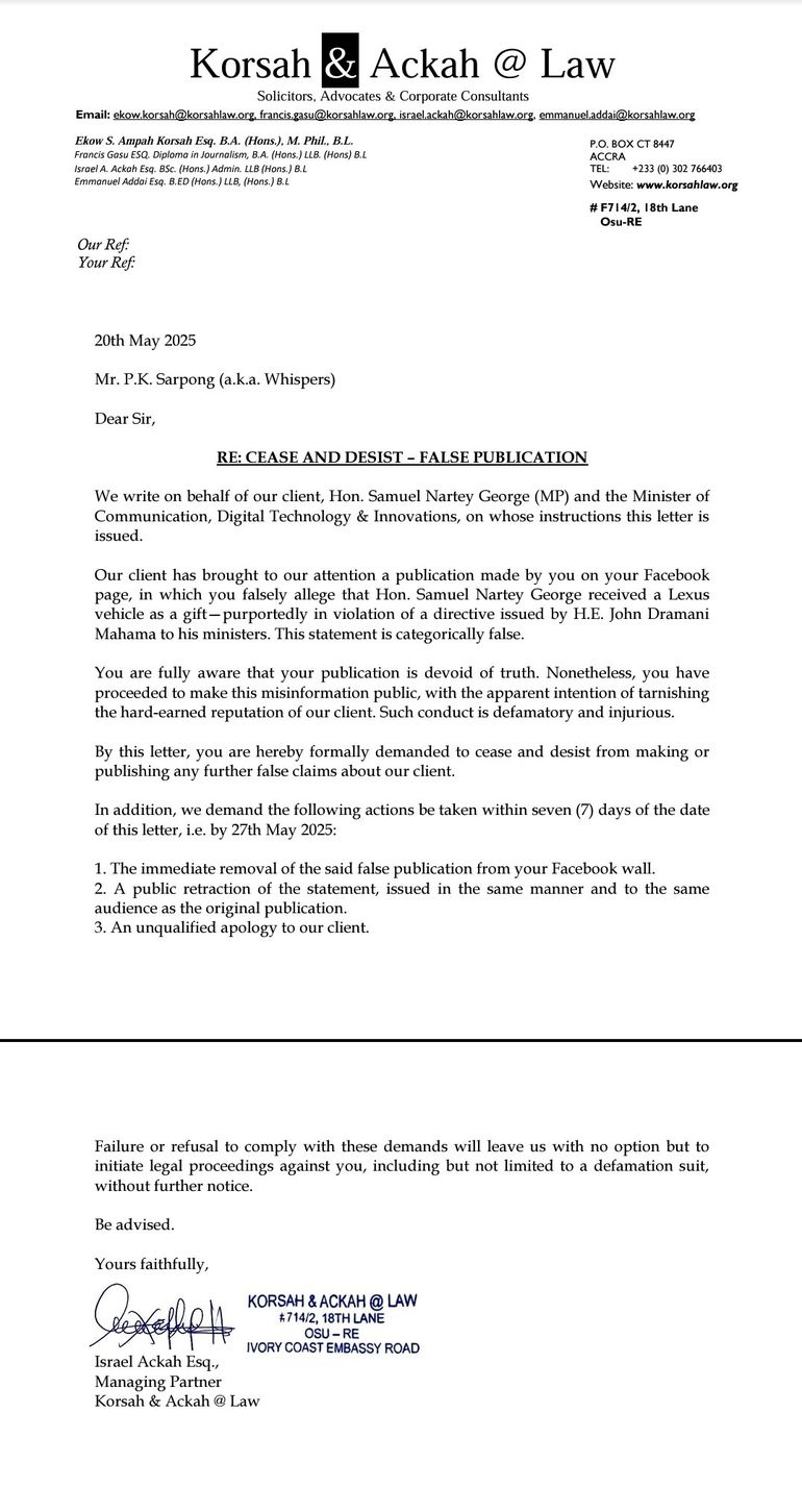 In response, Mr George, through his lawyers at Korsah & Ackah @ Law, described the allegation as "categorically false" and demanded an immediate retraction and apology.