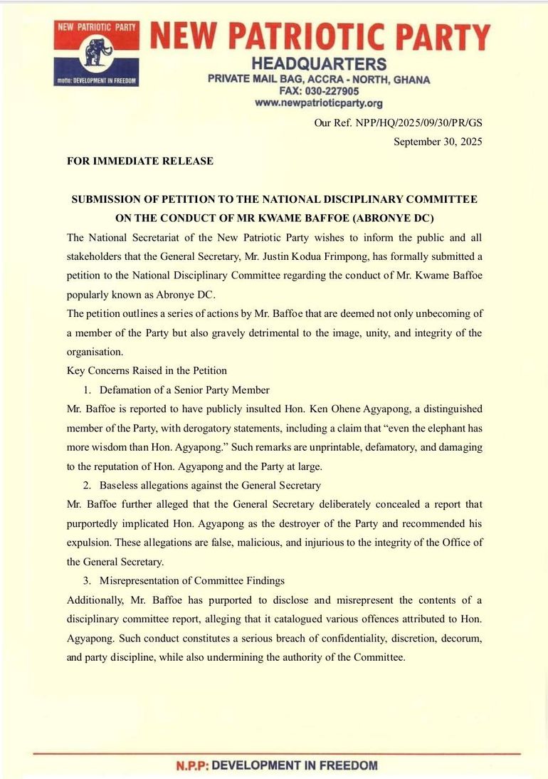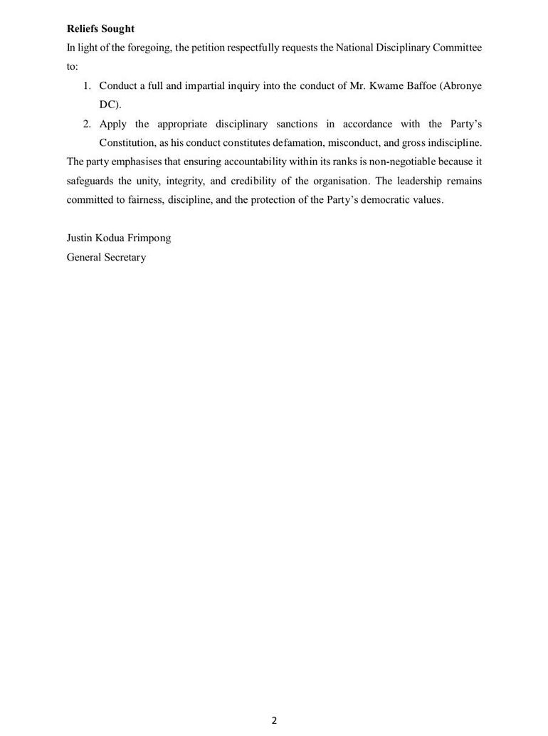 The petition therefore calls on the disciplinary committee to conduct a full and impartial inquiry into Mr Baffoe’s conduct and apply the appropriate sanctions in line with the NPP’s constitution. Mr Frimpong maintains that the behaviour constitutes defamation, misconduct, and gross indiscipline.
