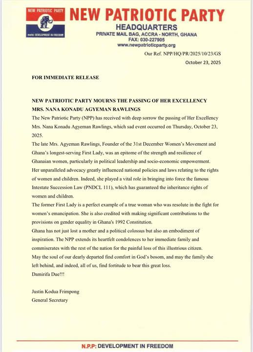 In a statement signed by the NPP’s General Secretary, Justin Frimpong Kodua, the party described her demise as a national loss, noting that Ghana has not only lost a mother and political icon but also an enduring source of inspiration.