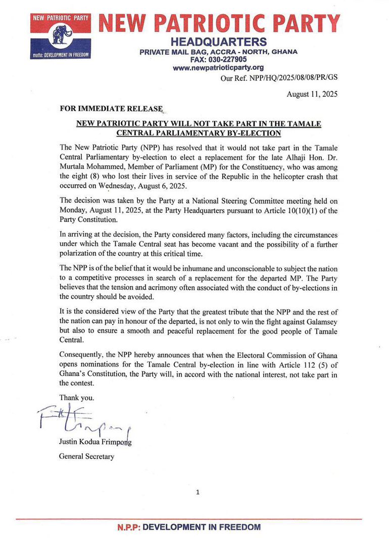 The decision, taken at the party’s National Steering Committee meeting on Monday, 11 August, was communicated in a statement signed by General Secretary Justin Kodua Frimpong.