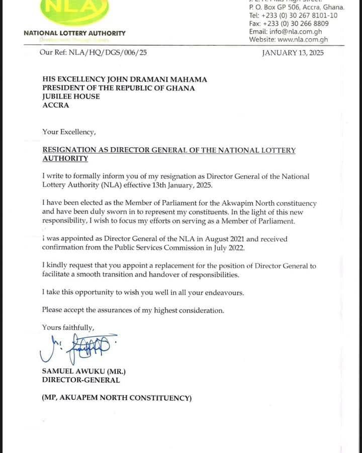 Member of Parliament for Akuapem North, Samuel (Sammi) Awuku, has officially resigned as the Director-General of the National Lottery Authority (NLA), effective immediately. The decision was communicated in a letter addressed to President John Dramani Mahama, dated Monday, 13th January 2025.