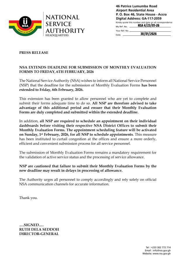 The National Service Authority (NSA) has extended the deadline for the submission of Monthly Evaluation Forms by National Service Personnel (NSP) to Friday, February 6, 2026, in a move aimed at giving outstanding personnel additional time to complete the mandatory process.