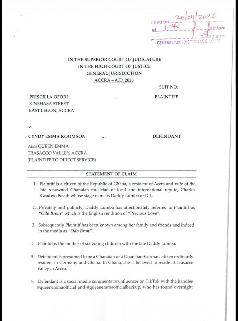 Priscilla Ofori, popularly known as Odo Broni and widow of late Ghanaian highlife legend Daddy Lumba, has taken legal action against TikToker Cyndy Emma Koomson, widely known as Queen Emma, over alleged defamatory statements made online.