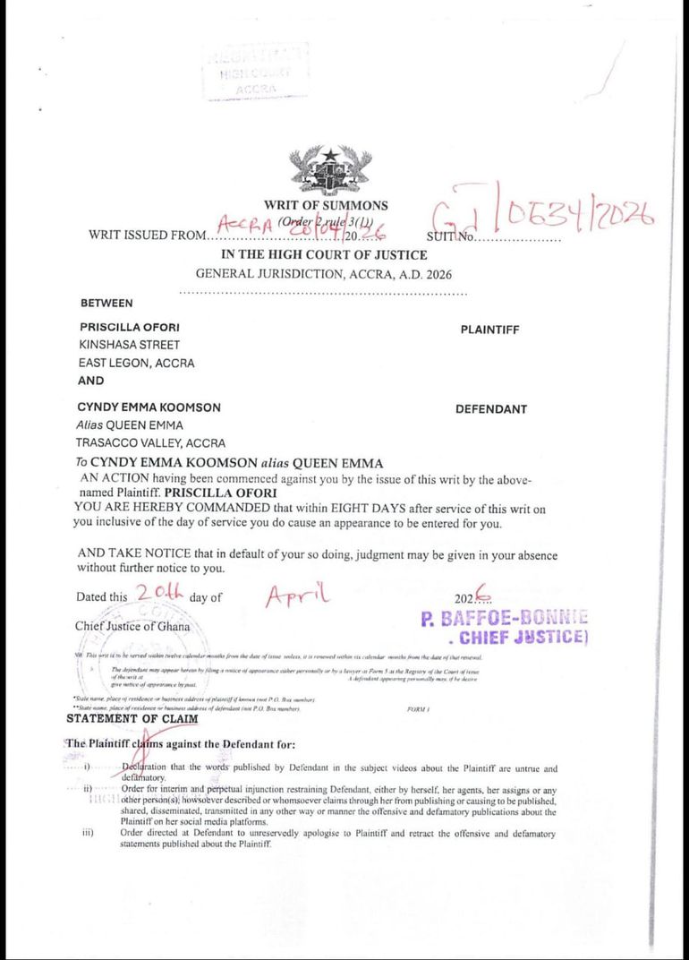 According to details contained in the writ, Odo Broni and her six children have reportedly been subjected to repeated cyberbullying allegedly led by Queen Emma and members of a group identified as “Team Legal Wives.”