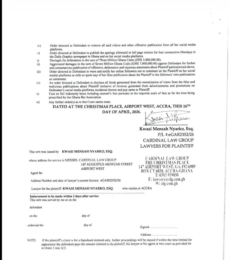 • Her legal team is seeking GH¢10 million in damages, along with a court order for a public apology to be published in the Daily Graphic and on social media platforms.