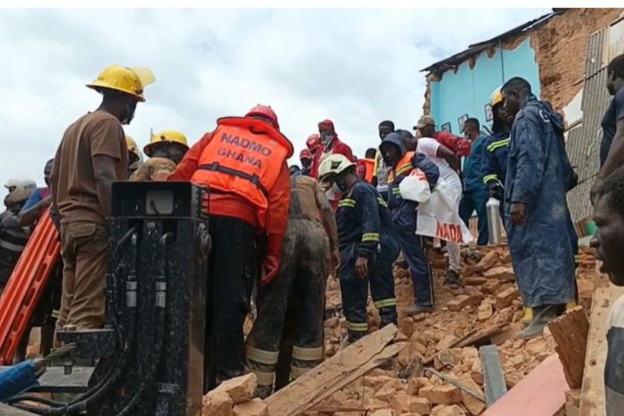Rescue teams from the Ghana National Fire Service, National Ambulance Service, National Disaster Management Organization, and Police are currently managing the situation and searching through the debris.