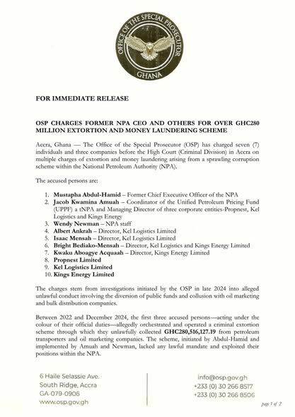 The Office of the Special Prosecutor (OSP) has charged the former Chief Executive Officer of the National Petroleum Authority (NPA), Dr Mustapha Abdul-Hamid, along with nine (9) others, in connection with a GH₵280 million extortion and money laundering scheme allegedly orchestrated through the Authority.