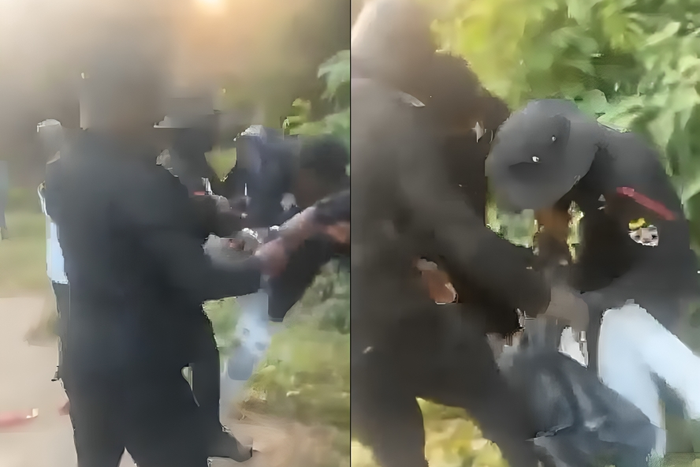 The situation quickly escalates when the young man resists being handcuffed. In the video, he is seen striking one of the officers, who retaliates with a forceful punch as the scuffle intensifies.