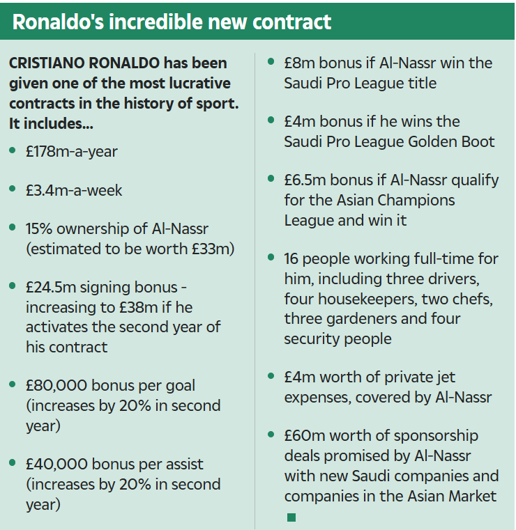Add in performance bonuses of £4 million (GH₵ 64 million) for top scorer, £8 million (GH₵ 128 million) if Al-Nassr win the league, and he could bank over half a billion quid.