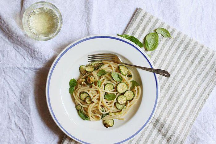 Simple ingredients become a dish very quickly when a cook expert enters the kitchen. Because they know how to multi task, this legendary pasta recipe is worth a try. While the pasta water is boiling, the zucchini are frying. Then the spaghetti is cooking. A quick purée is made out of some of the zucchini, and then it's all tossed together. The result is a fast, exceptionally tasty pasta dish, where the sauce clings to each strand of spaghetti. Don't think the frying or the touch of butter will make this dish heavy.