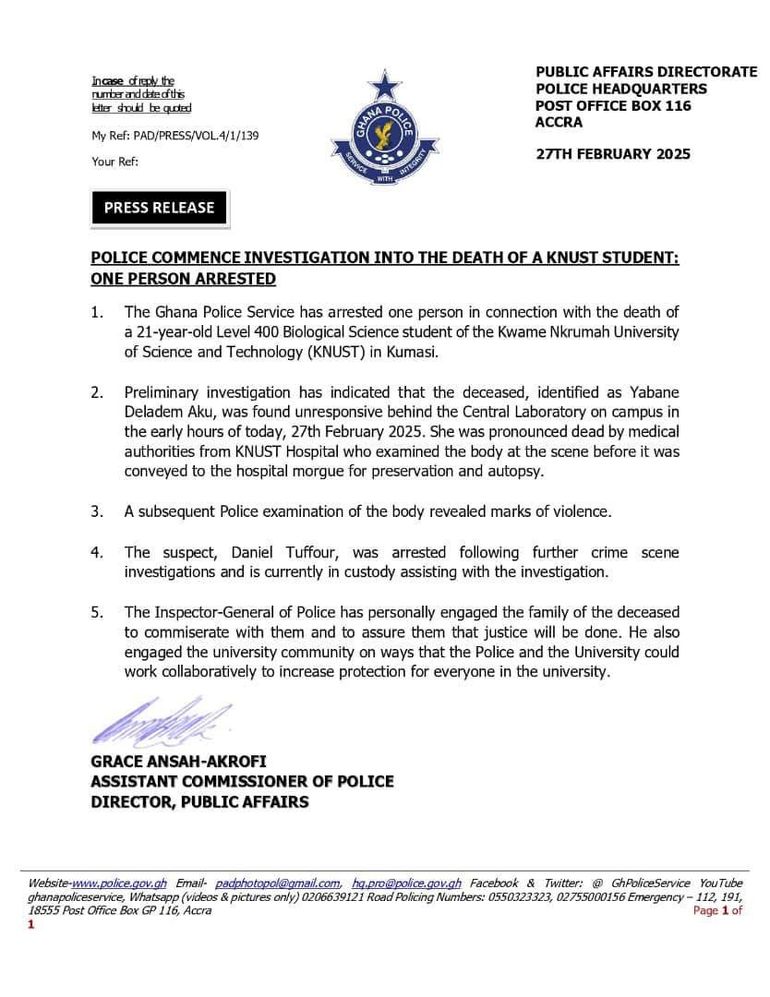 The Ghana Police Service has confirmed the arrest of a 21-year-old student from the Kwame Nkrumah University of Science and Technology (KNUST) in connection with the murder of a final-year female student.