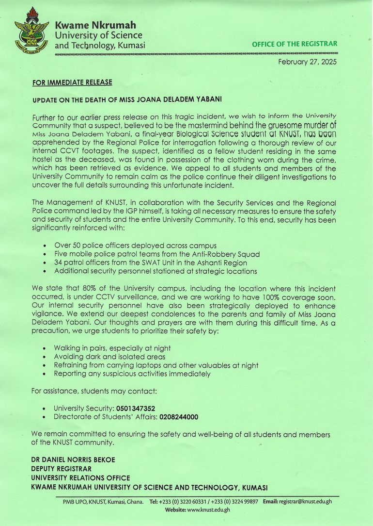 The statement, signed by Dr Daniel Norris Bekoe, Deputy Registrar of the University Relations Office, further noted that 80% of the university campus, including the location of the incident, is under CCTV surveillance, with plans to achieve full coverage soon.